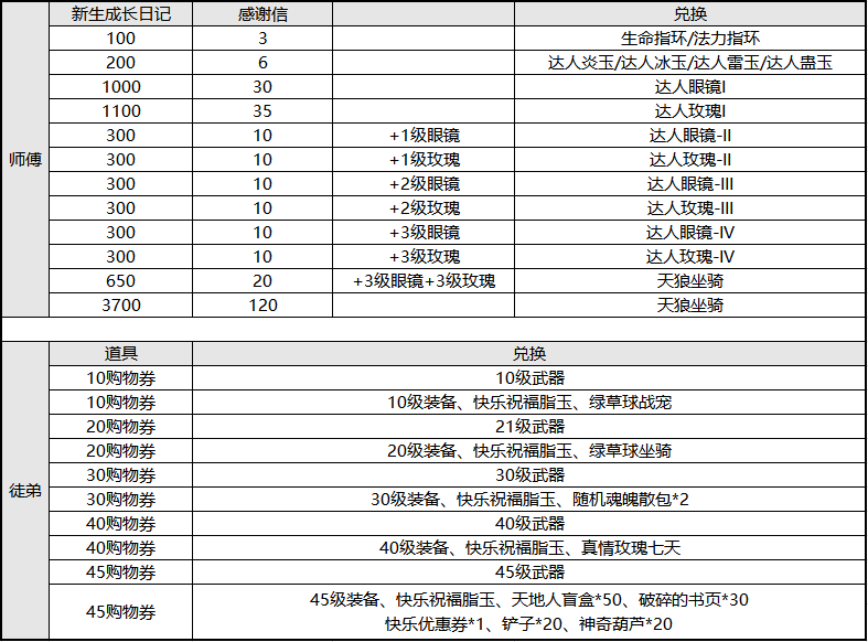 师徒任务全面更新,徒弟专属奖励加码,全新新增 40 级、45 级成长奖励。欢迎各位玩家前往新生指导员、新生兑奖员处领取体验。